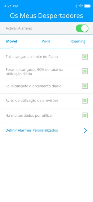 • Alarmes: defina alarmes personalizados de utilização de dados para evitar despesas adicionais e “surpresas” na sua factura