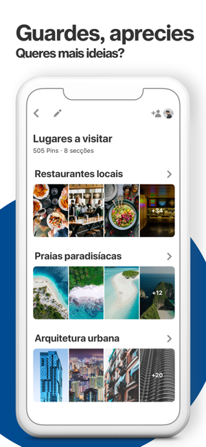 O Pinterest é um marcador visual que te ajuda a descobrir e a guardar ideias criativas. Utiliza o Pinterest para, entre outras coisas, cozinhar, planear viagens, fazer projetos de melhoria da casa.