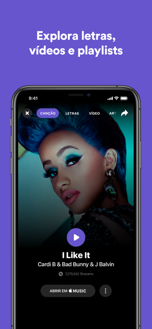 • Ligue à Apple Music ou Spotify para reproduzir faixas integrais no Shazam