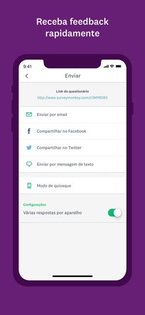 • Envie seu questionário por email, mensagem de texto ou mídias sociais