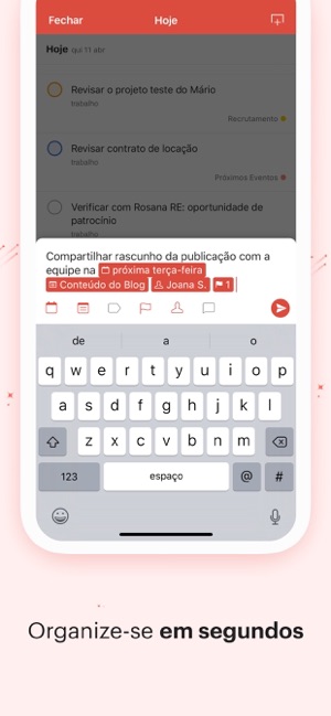 - Capturar e organizar as tarefas no momento em que eles aparecem na sua cabeça, em linguagem do dia a dia, através da Adição Rápida. Por exemplo: "Ler 30 páginas amanhã às 20h #livros" criará uma tarefa para amanhã, às 20h em seu projeto chamado Livros.