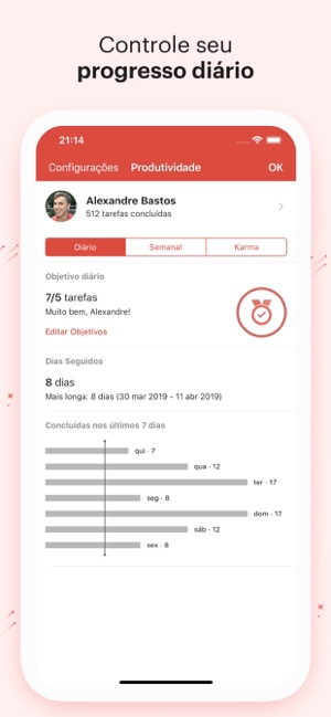 - Ver o seu progresso diário e semanal com gráficos de produtividade especialmente personalizados.
