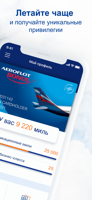 Весь функционал личного кабинета участника программы лояльности «Аэрофлот Бонус», полноценно реализован в мобильном приложении: проверяйте баланс счета, покупайте билеты на самолет за бонусные мили, обменивайте мили на бонусы партнеров программ лояльности или повышение класса обслуживания. Также вы можете оформить виртуальный подарочный сертификат на приобретение авиабилета.