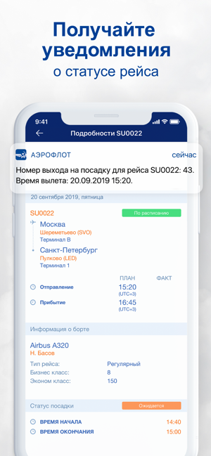 Настройте персональные уведомления специально для себя и получайте всю важную информацию вовремя - статус рейса, актуальная информация об авиаперелете (задержка или отмена рейса, правила оформления и провоза багажа, правила безопасности).