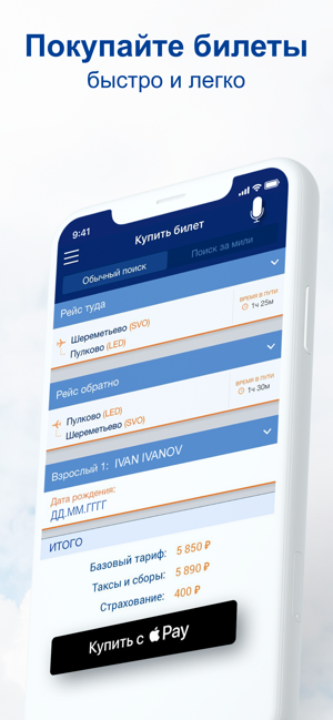 Технологичный интерфейс – просто отсканируйте документы и необходимые для оформления билета поля будут заполнены автоматически. Оплатить билет на самолет можно в одно касание при помощи технологии Apple Pay.