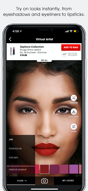 • TRY on makeup digitally using facial recognition technology —from eyeshadows to lipsticks and false lashes