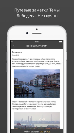 Официальное приложение с описанием путешествий Артемия Лебедева по всему миру и поиском самых дешевых и выгодных авиабилетов в партнерстве с компанией Aviasales.