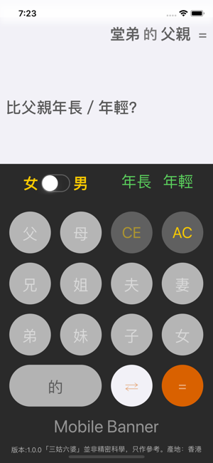 以計算機的操作方式輸入親戚關係,讓您快速查詢親戚的稱謂。