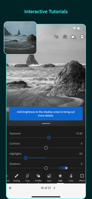 • INTERACTIVE TUTORIALS: Get inspired and learn how to make the photo edits you want by completing step-by-step lessons curated by fellow photographers