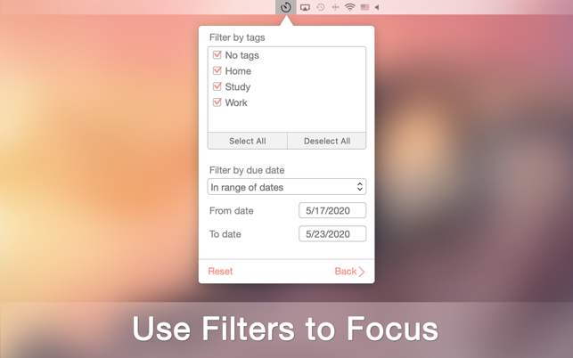 - Use filters by tags and due dates to keep focussed on the most important tasks