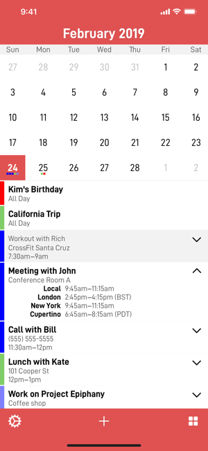 The calendar view provides a more traditional view to explore your events with. You can quickly jump to a particular day and see the events scheduled. Each event is expandable to see when the event is in each timezone, perfect for coordinating a meeting or call.