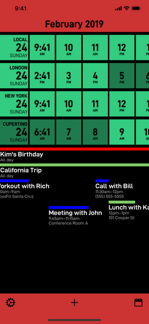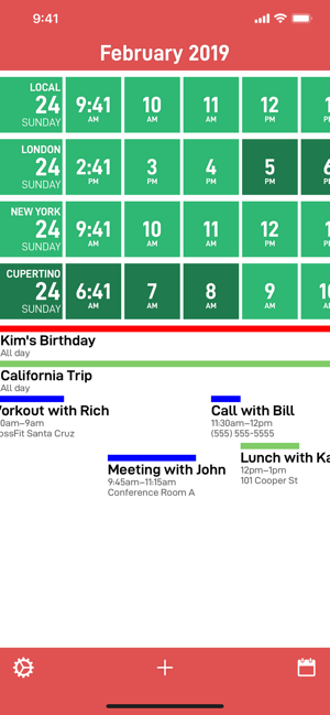 On the Apple Watch Calzones provides a rich timezone conversion tool. Turn the Digital Crown to compare the time in your selected places. Then once you find the time you are looking for you can tap any of the locations to quickly create an event at the time shown, right from your Apple Watch! Swipe to the right to see a list of your upcoming events all shown in one place. (Requires an Apple Watch)