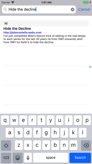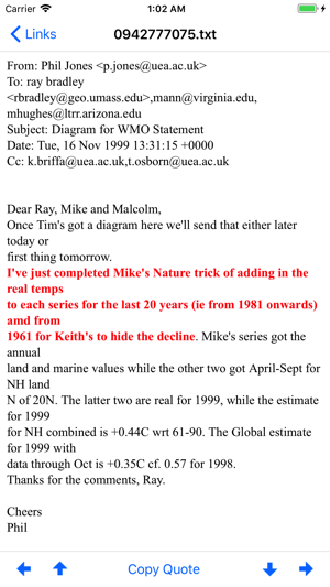 This free Climategate App is specifically designed for you to use in situations of poor Internet coverage, such as during your daily commute. The many excellent online Climategate repositories suffer the shortcoming that they are web based. The Climategate App addresses this shortcoming, by storing all required resources locally, on your iPhone.