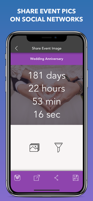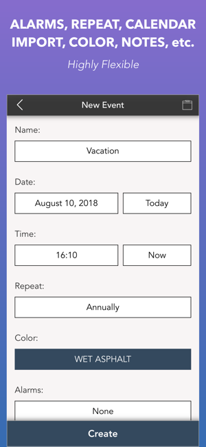Countdown to Big Events was designed with simplicity and functionality. Stunning graphics make tracking time easy and awesome. Personalize each event, using multiple theme colors, alarms, notes, repetitions and other customizations.