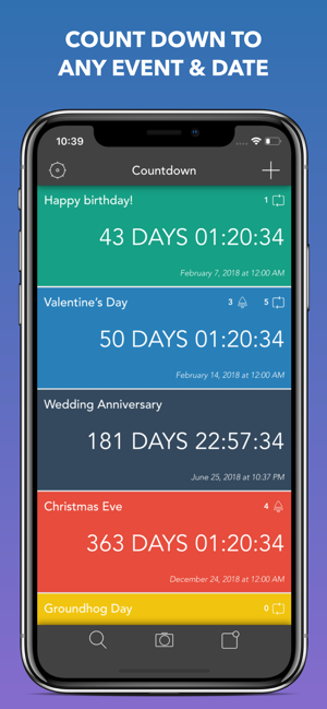 Countdown to Big Events is the only countdown app that combines UNLIMITED dates and events with a completely clean and intuitive interface.