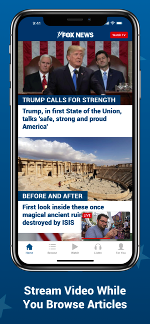 The “Watch” screen is your place to sit back and enjoy live and on-demand video featuring your favorite Fox News Channel personalities. You can also catch up on full episodes of Fox News Channel shows* or watch free highlights.