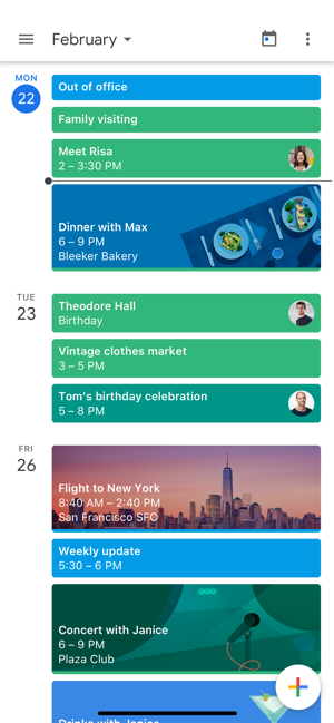 The app is great but there are 2 things I wish they did. 1: more colors added for events. I wish they had more colors to choose from when writing in an event. I am the kind of person that likes to keep certain events in the same color so i know that that event is work, party, meeting, holiday, birthdays, vet appointments, etc. But the color selection is a bit limited for me and there are colors that i never use because it makes no sense when i associate that color for that event, like the color flamingo. I wish they had different kinds of blues, purples, greens, reds, oranges, and pink. Especially since the purple for reminder you cannot change, so placing an event in that color confuses me. 2: I wish the photo used for a location was based on a photo of what the location looks like and not from photos that people upload from their cellphone to google maps. The fault is google maps. The photo location for an area should be something you should have the option of selecting in calendar and the logo should be an option. Their should also be an option on google maps where someone can select the primary photo of that location when flagging a picture. For example, my dog vet is pet smart Banfield but the picture shown on my calendar is a lady with her dog. That is not the location of the vet, it should be a picture of the front of the store, even though there is a picture of that, i cant select it.