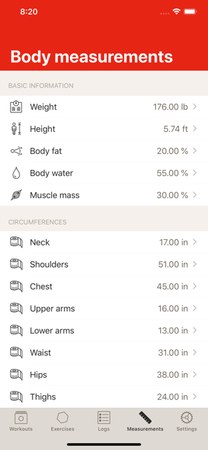 • Track your body measurements and analyze your progress in interactive line graphs: some body measurements (weight, height, body fat percentage and waist circumference) will also be synced with the Health app
