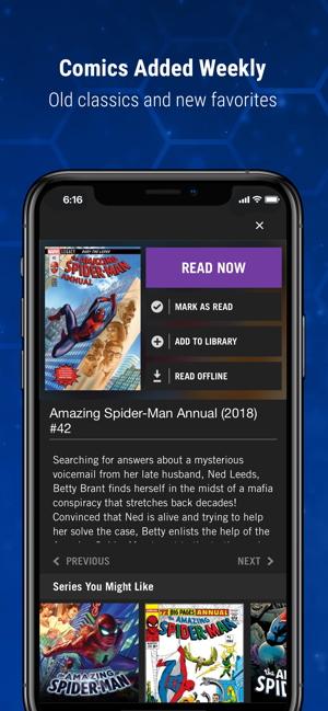 I have always been a comic book fan. However I live in a rural place, and there were never any places to buy comic books of any kind growing up. Having this app and being able to read all the stories I wanted to is perfect. Curated lists of things like universe spanning events make this app easy to use. A library of over 25k comics would be daunting if it weren’t so organized. If you find an art style or writer you like you can find all their past works in Marvel. The cell by cell reading is great on a phone and even on unconventional frames it scrolls through the dialogue and action in the order it was meant to be. For the most part. Occasionally there will be a place where if you don’t zoom out you may have missed a text box. It is still being updated and curated weekly with newer and old issues. If I had bought these comics new or even secondhand I would have spent a few thousand dollars on all I’ve read, for a fraction of the cost. Well worth it in my opinion.