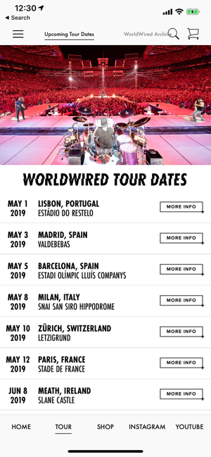 The app is your WorldWired tour guide. Before the show pick up info about tickets and VIP packages, special offers, opening bands and more. After the show check out the set list and the app will be packed with photos and videos along with information about live downloads of the show.