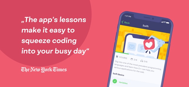 • "The app’s lessons are bite-size to make it easy to squeeze coding into your busy day." – The New York Times