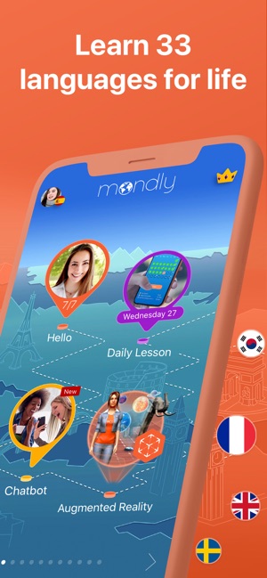 All these make Mondly the best way to learn Spanish, American English, British English, French, German, Portuguese, Italian, Russian, Norwegian, Danish, Swedish, Korean, Japanese, Chinese, Greek, Romanian, Vietnamese, Indonesian, Hindi, Hebrew, Polish, Bulgarian, Ukrainian, Czech, Croatian, Finnish, Persian (Farsi), Afrikaans and Turkish for FREE.