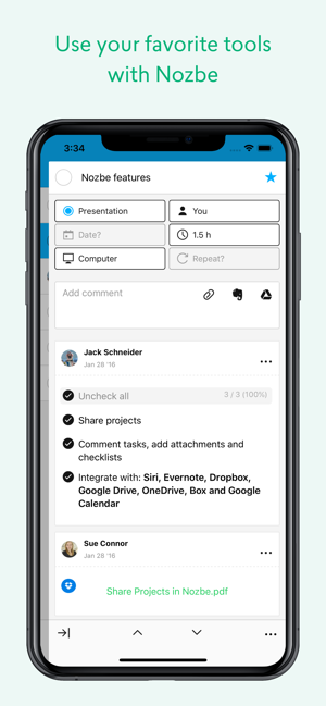 My main want, that could make this five stars, is better synchronization with Evernote. Currently it will sync notes with reminders which great! However it doesn’t sync any other feature such as the folder the note ia from or any tags. Also when the note title changed in evernote this information does not sync to NOZBE. Finally it would be nice if a task created in Nozbe would sync to a new reminder in evernote. Currently alms notes have to start in evernote.