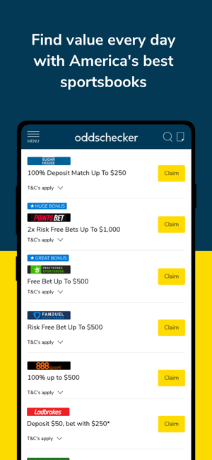 Maximise your winnings with Oddschecker by comparing betting odds across the USA with leading bookmakers, such as DraftKings, FanDuel, Sugarhouse, BetStars, 888, BetAmerica, Points Bet and Resorts Casino. We also provide expert picks and previews covering all your weekly sporting action across NFL, NBA, MLB, NHL and more. We take special care to identify the stats and trends that matter and find value for you across the board. Looking for all the best offers in one place? Well we also source and feature the best deals for new and existing customers because odds comparison is just part of the story. So take advantage of our combination of real time odds and tipping insight to supercharge your winnings.