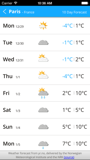 Add your favorite cities and get the weather forecast for 10 days. You can also check out detailed conditions for a given day.