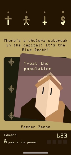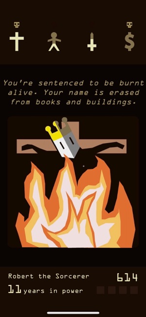 Each year of your reign brings another important – seemingly random – request from your unpredictable kingdom as you strive for balance between the church, the people, the army, and the treasury. Prudent decisions and careful planning make for a long reign but unforeseen motivations, surprise events, and poor luck can take down even the most entrenched monarch. Extend your reign as long as possible, forge alliances, make enemies, and find new ways to die as your dynasty marches along through the ages. Some events will span on centuries, with an intrigue involving burning witches, scientific enlightenment, wicked politics and, maybe, the Devil himself.