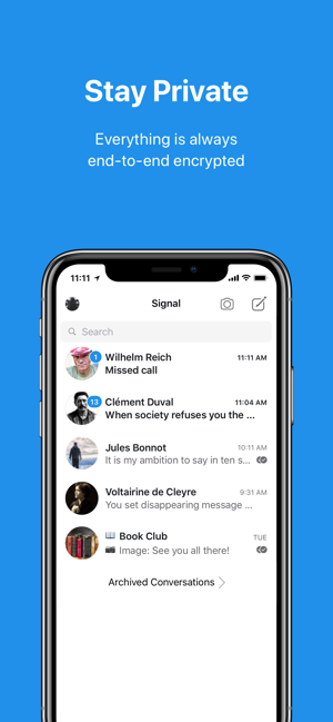 • Say anything – State-of-the-art end-to-end encryption (powered by the open source Signal Protocol™) keeps your conversations secure. Privacy isn’t an optional mode — it’s just the way that Signal works. Every message, every call, every time.