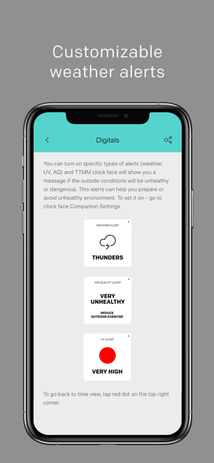 TTMM-S is a special collection of TTMM designer clock faces, equipped with the weather, UV level and air quality index feature. This collection is made for the Fitbit Versa, Fitbit Versa 2 and Fitbit Versa Lite smartwatches. TTMM-S app is available in a simple monthly subscription plan. It has a friendly interface with a fast and easy access to upload your favorite clock faces. It is designed in a minimal style and highly functional. This special collection comes with an extra features showing current weather and air quality information and is equipped with a unique weather alert option (dangerous weather, very high UV or unhealthy Air Quality Index).