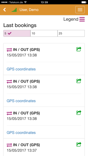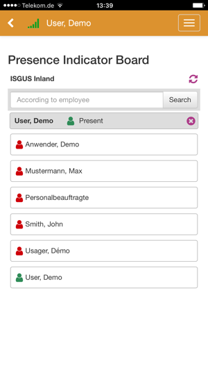 In the event of an emergency (e. g. fire), the Evacuation report provides an overview of all employees informing on who is still inside the building and who is already safe.